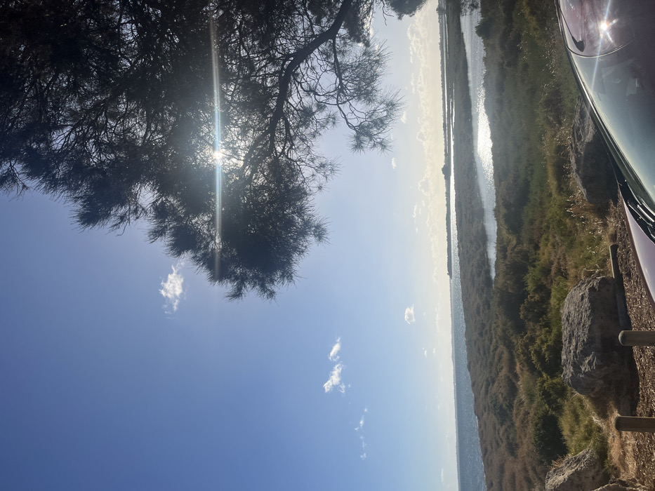 The image captures an outdoor scene in Coodanup, Australia, under a clear blue sky dotted with scattered small white cumulus clouds. The sun is positioned in the upper right quadrant, casting a strong glare and prominent lens flare through the dense, dark branches of a tree, likely a conifer, which occupies the upper right section of the frame. Below the horizon, a wide body of water, indicative of an estuary or bay, extends across the mid-ground, paralleled by a narrower, highly reflective water channel closer to the foreground. Between these water bodies and on their banks, there is extensive low-lying scrub vegetation with green and brown hues. In the immediate foreground, several large, weathered grey boulders are visible, along with two dark wooden posts embedded in the ground. The hood and windshield of a dark red vehicle are present in the lower right corner, reflecting sunlight. No individuals or specific actions are depicted.