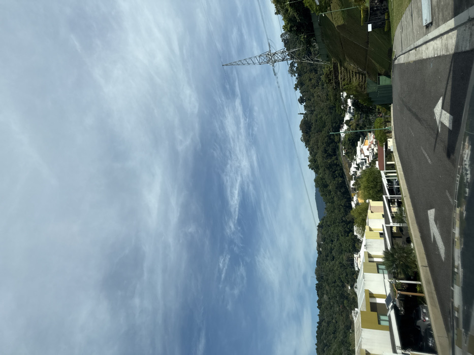 This image depicts a residential area within Nuevo Cuscatlán, El Salvador, characterized by a sloping asphalt road leading uphill, bordered by concrete curbs. In the immediate foreground, white painted arrows on the road indicate a straight direction and a left turn. The bottom edge of the frame shows a reflection, likely from a vehicle's dashboard. On the left side of the road, a series of modern, multi-story houses are visible. These structures are predominantly white with yellow-accented sections and feature open carports beneath them, accommodating several parked vehicles. One carport exhibits an installed solar panel array. To the right of the road, a steep, terraced hillside covered in green grass ascends, with visible dark green retaining structures or barriers. A prominent metal lattice utility tower, supporting power lines that traverse the upper mid-ground, stands on this hillside. The mid-ground features further residential development with white and light-colored houses nestled into the surrounding hilly, densely forested terrain. The background is dominated by a range of tree-covered mountains or hills. The sky is partly cloudy, displaying a mix of blue sky and scattered white to light grey cloud formations. No individuals are visible.