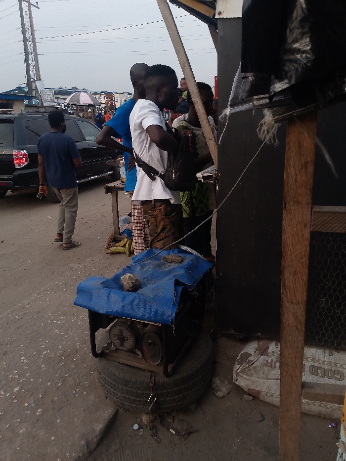 Four men stand near a black car and a makeshift shop. One man wears a blue shirt, another a white shirt and patterned shorts, while another wears a blue shirt and khaki pants. A generator sits on a tire, covered by a blue tarp and weighed down by rocks. The ground is dirty and littered. In the background, power lines and a market umbrella are visible.