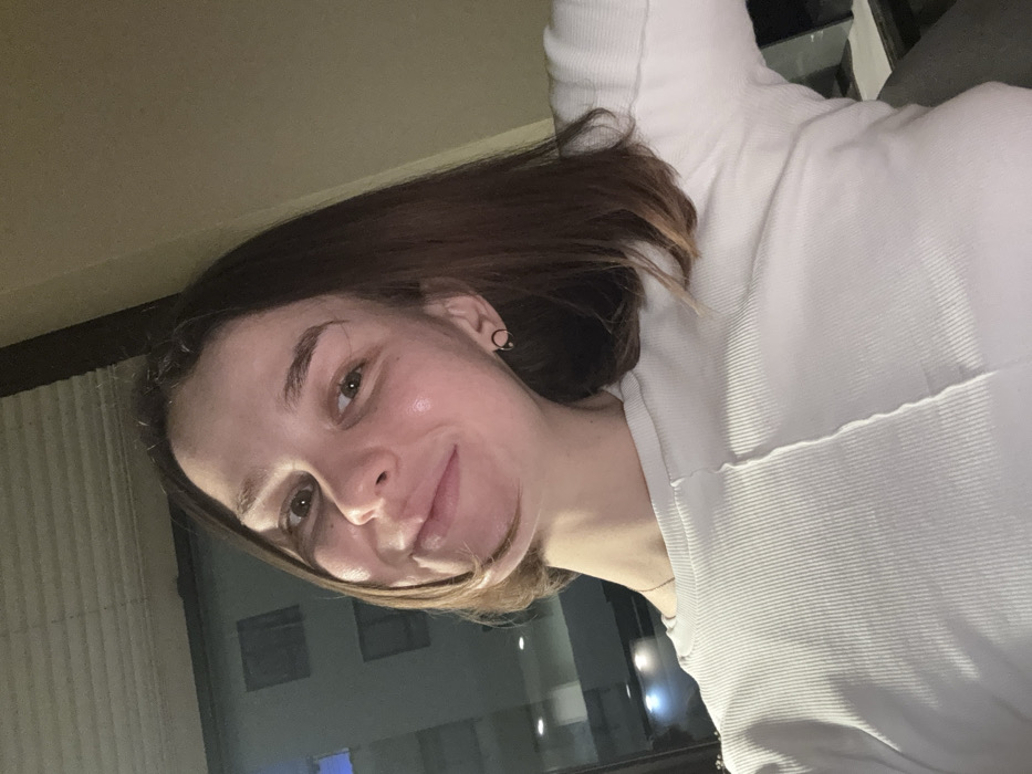 A young woman poses for a selfie. She has light skin, brown hair, and dark eyes. She's wearing a white ribbed shirt. Her head is tilted to the side and she's smiling slightly. An earring is visible in her left ear. In the background, a building and some dim lighting can be seen through a window. The image has a slightly rotated orientation.