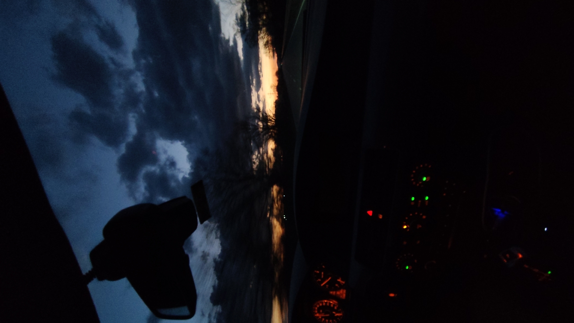 The image appears to be taken from inside a vehicle, looking out through the windshield. On the left, dark, stormy clouds fill the sky, partially obscured by the rearview mirror. A sliver of sunset or sunrise illuminates a line of trees or foliage in the middle. To the right of the windshield is the dark interior of the car, with illuminated gauges and controls visible on the dashboard. The location is unknown, and it is impossible to verify if it is in Negovan, Bulgaria, as there are no geographical landmarks in the image. There are no people visible.