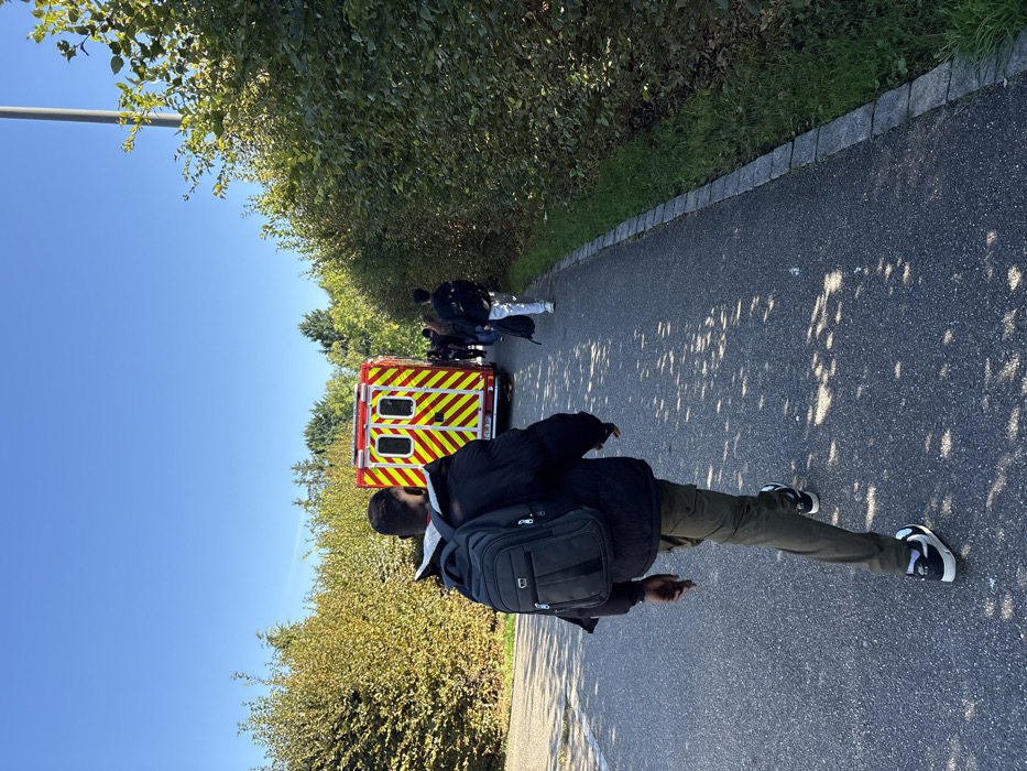 The image depicts an outdoor scene in Bischheim, France, under a clear blue sky on a sunny day. A paved asphalt pathway extends from the foreground into the background, featuring dappled sunlight patterns from overhead foliage. Dense hedges and trees with green and yellow-green leaves border both sides of the pathway. In the foreground, a male individual with dark skin, wearing a dark puffer jacket, olive green cargo pants, and black and white sneakers, walks away from the camera. He carries a black backpack with silver accents. Further along the pathway, the rear of a stationary ambulance is visible, marked with a distinctive red and yellow reflective chevron pattern. Its license plate, partially visible, reads "Z-496-BP." A group of several individuals, appearing to be young adults, are congregated near or walking towards the ambulance on the right side of the pathway. A tall, slender grey pole is visible rising from the foliage on the right side of the scene. The pathway's edge features a curb of grey cobblestones alongside green grass.