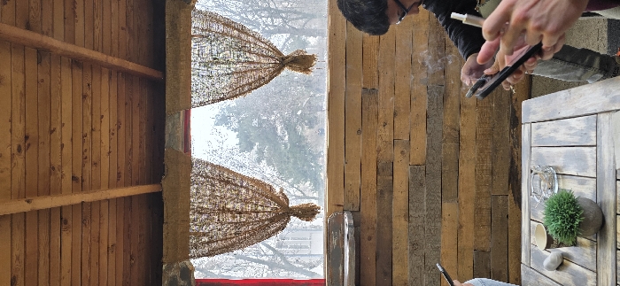 The image depicts an indoor or semi-enclosed seating area in Sliven, Bulgaria. The ceiling is constructed from exposed wooden planks and support beams. Below the ceiling, a raw concrete or rough-textured beam runs horizontally, beneath which two large windows are set into red frames. These windows are fitted with light brown, loosely woven fabric curtains tied back centrally. A wall section beneath the windows consists of horizontally arranged wooden planks. Through the windows, an exterior scene is visible, featuring bare deciduous trees, a prominent evergreen tree centrally positioned, and a building partially visible to the far left. The outdoor lighting appears diffuse. In the foreground, a rectangular table made of weathered wooden planks occupies the lower half of the frame. On the table, from left to right, are a white elongated smooth object, a light brown paper cup, a small artificial green plant in a grey pot, and a clear glass ashtray containing ash and at least one cigarette butt. At least three individuals are partially visible within the scene. On the right side, a person with dark hair, wearing glasses, is visible from the forehead down. This individual holds a dark-colored smartphone with both hands, actively engaging with its screen. A lit cigarette is held between fingers of the person's left hand, producing a plume of smoke. A metallic vaping device is also visible near their right hand. Adjacent to this individual's hands, another set of fingers is visible, also interacting with the same smartphone. On the far left, a hand and lower forearm, clothed in a light-colored long-sleeved garment, are visible holding another dark-colored smartphone.
