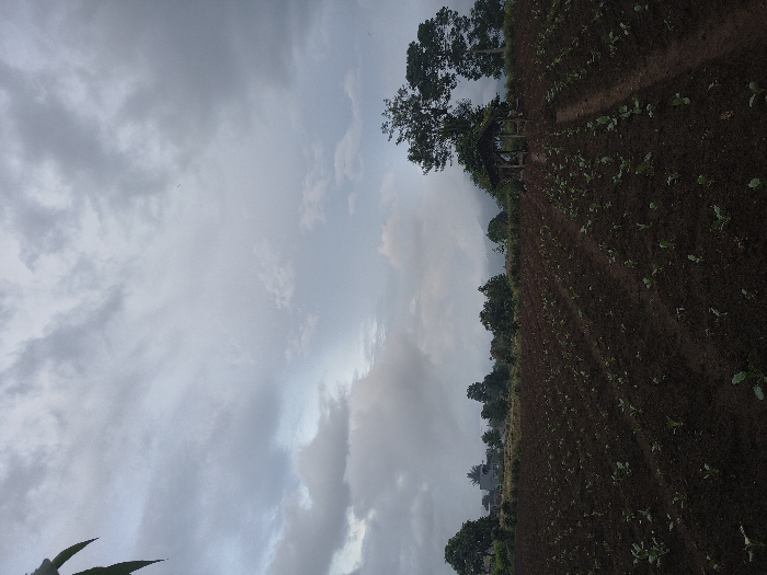 A landscape under a cloudy sky depicts a cultivated field. Rows of plants, possibly crops, stretch across the dark soil. Trees and a small structure with climbing vines are visible along the edge of the field. The sky is overcast with a mix of light and dark gray clouds, suggesting a potentially stormy or overcast day.