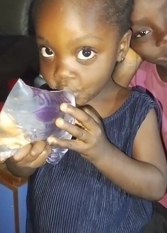 A young, dark-skinned girl drinks from a plastic bag. She is wearing a dark blue, sleeveless shirt with vertical lines. A second dark-skinned child is partially visible behind her, wearing a pink shirt. The girl holds the bag up to her mouth with both hands and looks into the camera. The bag is transparent, with some purple graphics and text printed on it. The background is a dimly lit room. The girls are near a blue side table.