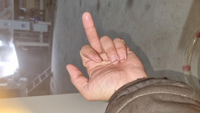 A person extends their middle finger, a gesture considered offensive, towards the camera. The hand appears weathered, with dirt under the fingernails. A dark jacket sleeve is visible in the lower right. The background is blurred, showing what seems to be an industrial site or a large piece of machinery and a gray wall. A transparent hose with red bands is visible in the upper right corner.