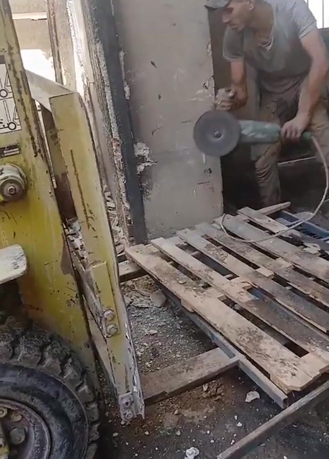 A man in a grey t-shirt and tan pants is using a handheld angle grinder to cut metal attached to a concrete wall. He is wearing a cap and sneakers. Sparks are flying from the point of contact between the grinder and the metal. He is crouching on a wooden pallet that is resting on a metal frame. Next to him is a yellow machine with a tire. An arm appears in the top left corner of the frame, possibly assisting in stabilizing the metal being cut. The setting appears to be an outdoor work area or construction site. The wall has a dark vertical streak on it. Part of a gated window is visible in the background.