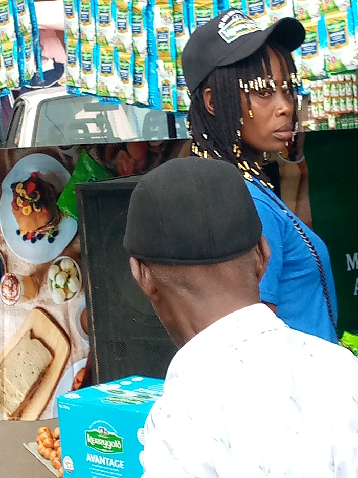 The image portrays an outdoor commercial scene in Aba, Nigeria. In the immediate foreground, the back of an individual wearing a black skullcap and a white shirt is visible, facing away from the viewer. Behind and to the right of this individual, a woman with dark skin is visible from the chest up, oriented towards the left. She wears a black baseball cap with a patch and a blue garment. Her hair is styled in dreadlocks or braids, extensively adorned with small, gold-colored beads, particularly around her face. Her gaze is directed towards the left. The background features rows of light blue and white packaged products hanging vertically, suggesting a retail display. A portion of a white vehicle is visible in the upper left background, reflecting its surroundings. To the left of the scene, a graphic or poster depicts various food items: a plate of pancakes topped with fruit, a bowl of white spherical food items, and sliced bread on a wooden board. A large light blue box labeled "Kerrygold AVANTAGE" occupies the lower central foreground. Further to the lower left, a cluster of small, round, brownish items is partially visible on a flat surface. A dark green surface with partial white text ("M" and "A") is visible on the right side of the background.