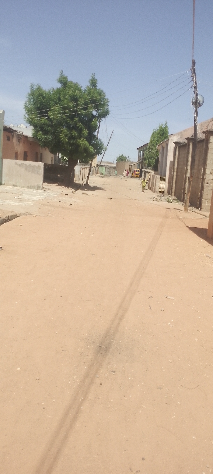 The image depicts a unpaved dirt road extending into the distance under a clear, light blue sky. The road, composed of light brown, sandy earth with scattered debris, features diagonal shadows cast from utility poles and overhead lines originating from the upper right of the frame. On the left side of the road, a large green tree with dense foliage stands in the mid-ground. Behind it and further down the road are various single and multi-story buildings, appearing constructed from concrete blocks, some with partial plaster finishes and visible signs of weathering. A low concrete block wall is present in the foreground on the left. The right side of the road is bordered by a continuous line of structures, including tall walls and buildings, predominantly constructed from concrete blocks. A tall utility pole, likely wooden, stands on the right, equipped with a circular street light fixture and multiple strung electrical wires. Further down the road on the right, a section of a fence with vertical slats is visible. In the background, approximately three human figures, appearing to be adults, are observed walking on the left side of the road. A yellow three-wheeled vehicle is positioned on the right side of the road, beyond these figures. Closer to the mid-ground on the right, a single individual, possibly a child, stands near the edge of the road, facing away or to the side. The scene represents a residential or semi-urban environment characteristic of Katsina, Nigeria, the city where Muhammadu Dikko Stadium is situated.