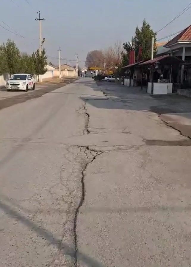 street in what seems to be a suburban or rural area on a sunny day. The road is cracked and shows signs of wear. On the left side of the road, there is a white car parked near a small building and some trees. On the right side, there's a structure that looks like an open-air restaurant or cafe with tables and chairs visible underneath the roof. The street extends into the distance, with a few other cars and buildings visible further down the road. Power lines run overhead. The sky is clear and light blue. There don't appear to be any people moving in the immediate view.