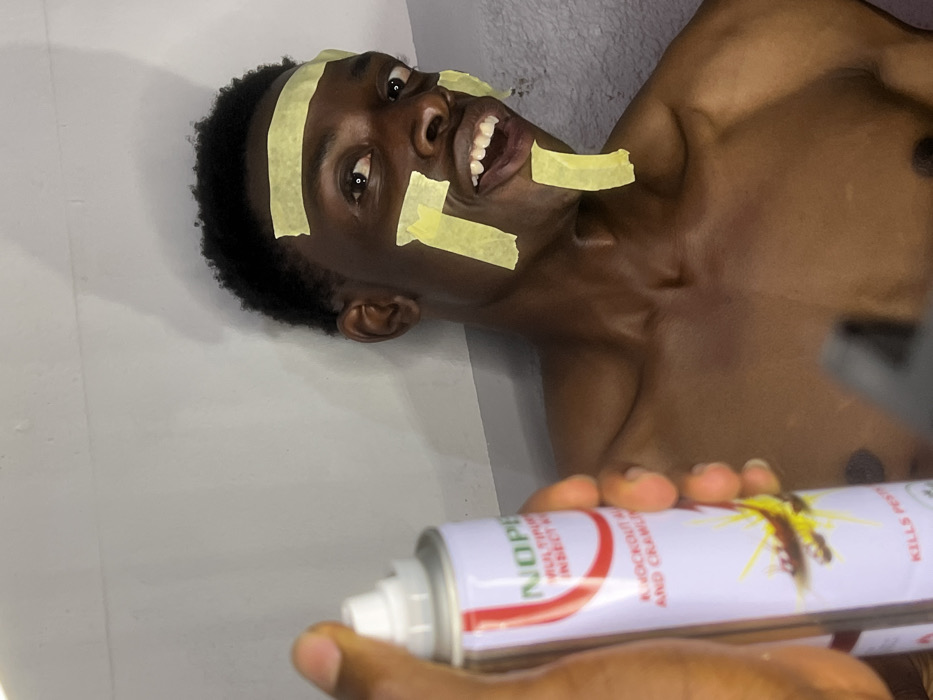 An indoor scene in Bar Gada, Nigeria, depicts a young adult male positioned against a plain, light-colored wall. The male, bare-chested, has short, dark, curly hair. His face features several strips of yellow adhesive tape: one horizontal strip across his forehead, one vertical strip on his left cheekbone, one horizontal strip below his right eye, and another vertical strip on his lower right jawline. He looks directly at the camera with wide eyes and an open-mouthed expression revealing his teeth, suggestive of a smile or grimace. In the foreground, a hand holds an aerosol can, partially obscuring the lower left portion of the image. The can is white with red and green lettering, displaying "NOPEN MULTIPURPOSE INSECT KILLER" and "KNOCKOUT ALL FLYING AND CRAWLING," with illustrations of a cockroach and an ant. The nozzle of the can is oriented towards the male subject.