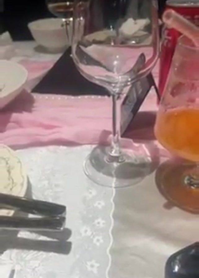 dinner table setting with multiple people. There are plates of food, glasses, cutlery, and beverages on a white tablecloth with a floral pattern. The food includes pasta, salad, and other dishes. Several people are seated around the table, some of them using their phones. The background shows a room with a window. The overall atmosphere appears to be a casual gathering or meal.