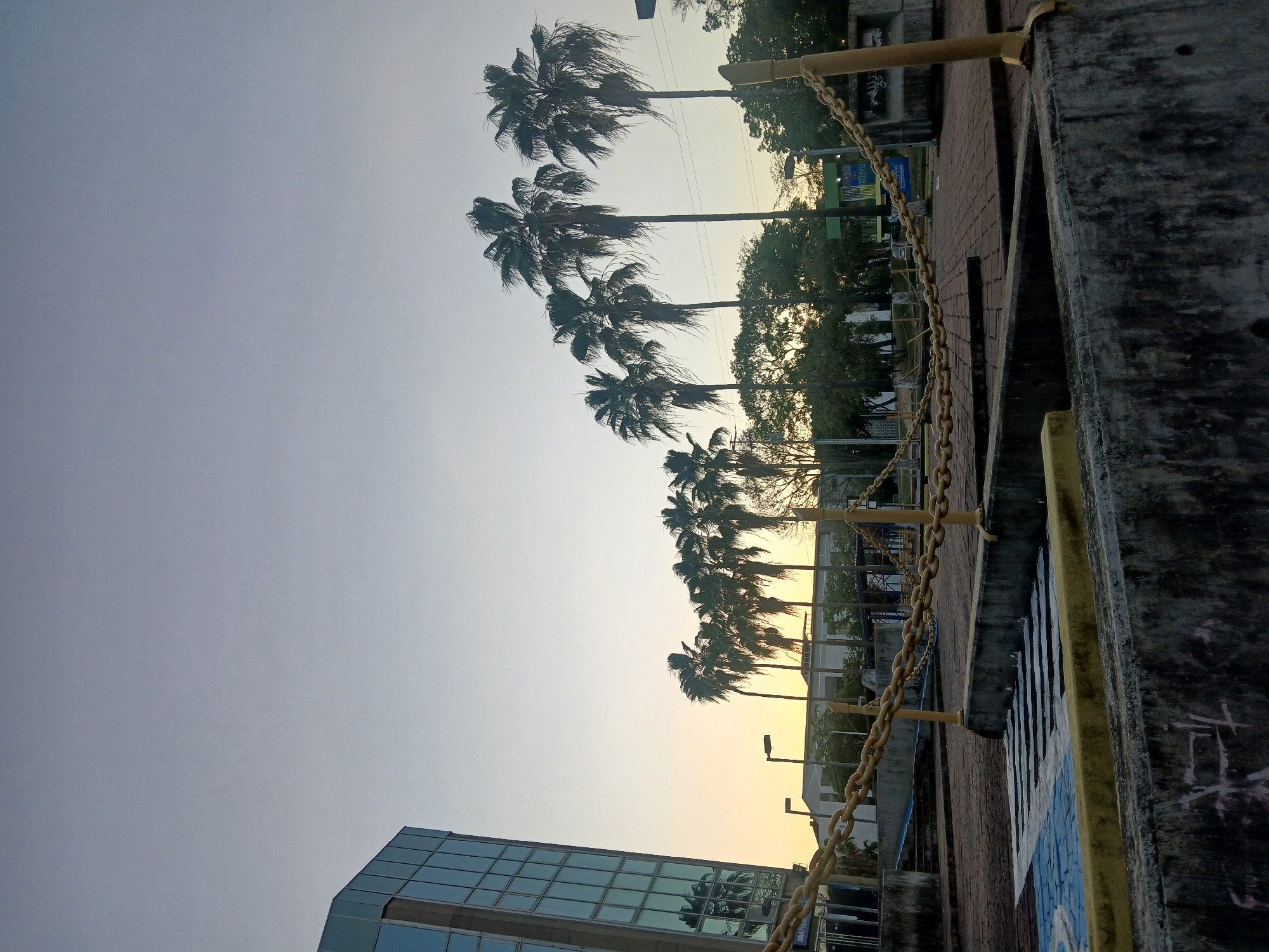 Here is a detailed description of the image: The image depicts a row of palm trees lining a walkway or promenade in Ciudad Guayana, Venezuela, based on the location in the query. The scene is taken from a low angle, looking upwards towards the trees and the sky. The sky appears to be a light gradient from gray to golden yellow. The palm trees are silhouetted against the sky and are sparsely leaved. Beside them, there's another row of mature trees of different species with foliage visible near the top. A concrete wall and curb run along the right side of the frame, with a rusted yellow chain acting as a barrier strung between posts. The wall shows signs of weathering and possible graffiti. In the lower left corner, there is a section of a modern glass-fronted building. The overall impression is of an urban or suburban area with tropical vegetation at twilight or dawn.