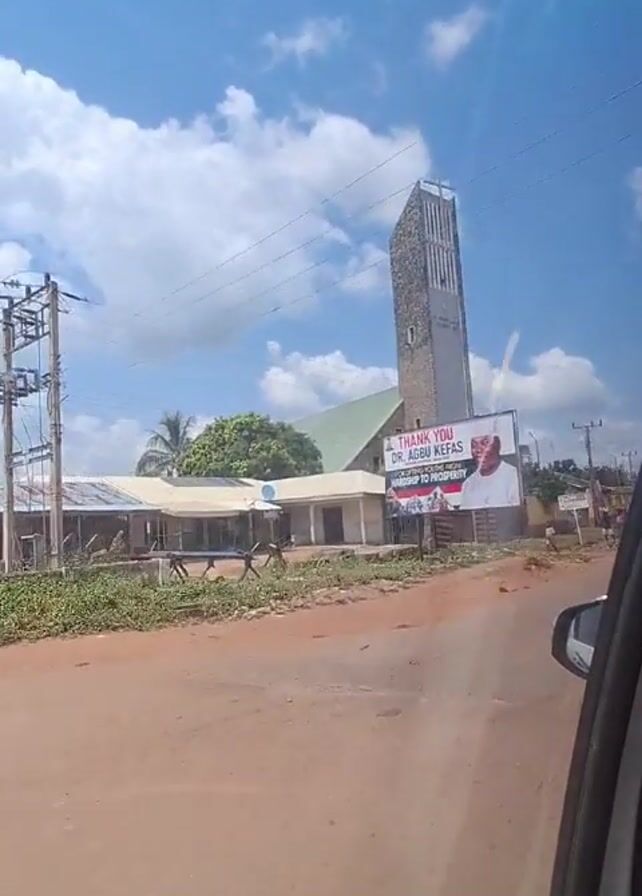 street scene with a tall church tower in the background under a blue sky with scattered clouds. A large billboard next to the church reads "THANK YOU DR. AGBU KEFAS FOR LIFTING YOUTHS FROM HARDSHIP TO PROSPERITY" alongside a photo of the person in question. A few buildings are visible. The street is reddish dirt. Two people on a motorcycle drive by and another motorcycle is visible in the distance. The video is taken from a moving car. The car's window frame is visible. Electrical wires run along the top of the frame.