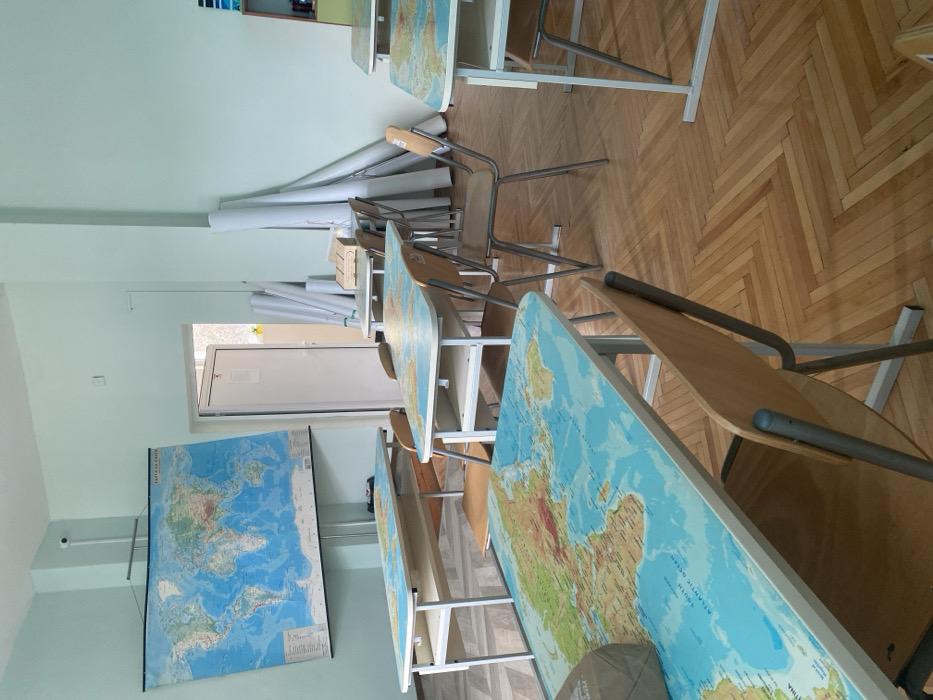 The image depicts an unoccupied classroom within Veliko Tarnovo, Bulgaria, characterized by light green walls and a herringbone wooden parquet floor. The room contains multiple student desks and chairs. Each desk features a light blue surface with a detailed world map printed on it. The chairs have light wooden seats and backs with metal frames. A large, pull-down wall map, titled "КАРТА НА СВЕТА" (Bulgarian for "Map of the World"), is prominently displayed on the left wall. A small white security camera or sensor is mounted high on the same wall. Towards the back left, a white door stands ajar, revealing an illuminated interior space with some yellow objects, possibly flowers, visible through the opening. To the right of this doorway, several large white rolls of material, possibly maps or paper, are propped against the wall. A light-colored wooden crate is also present near these rolls. One desk in the foreground on the left has a light brown paper bag or similar object placed on its world map surface. No individuals are present in the scene, and no specific actions or interactions are occurring. The environment suggests an educational setting, likely a geography classroom.
