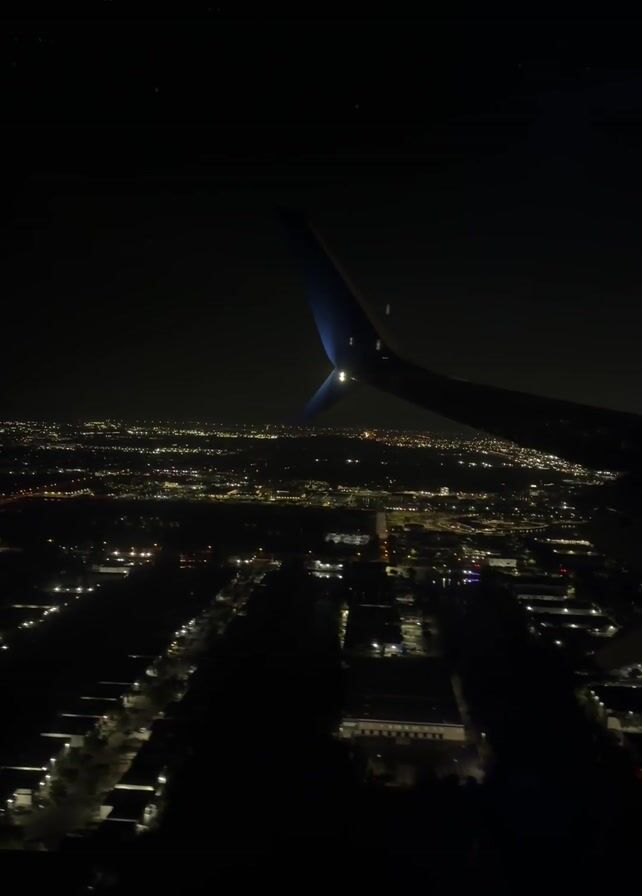 n aerial view of a city at night, seen from the window of an airplane
