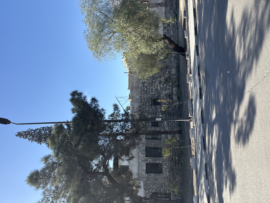 The image displays an outdoor street view in Damascus, Syria, under clear, bright daylight. The foreground features an asphalt road with visible cracks and faint markings, bordered by a concrete curb. Along the curb, several rectangular, light-colored concrete blocks are spaced out. Beyond the curb lies an unpaved strip of ground with sparse vegetation and several young saplings. Two mature trees dominate the midground: a large, dark green coniferous tree on the left partially obscures a building, and a multi-trunked deciduous tree with light green leaves leans distinctly to the right. A tall, black streetlamp pole stands upright near the center of the image, extending above the treeline. In the background, a multi-story building or wall is visible, constructed primarily from dark, irregular stones on its lower levels, featuring several dark-framed rectangular windows. The upper section of the structure, visible on the left, appears to be a lighter color. Portions of additional rooftops and a light-colored building with a visible scaffolding-like structure are discernible above the main stone edifice against a clear blue sky. No individuals or specific actions are depicted.