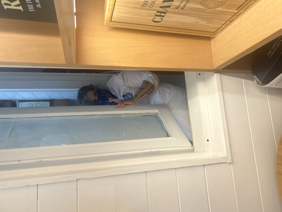 A woman wearing a white t-shirt, white pants, and a blue bandana over her face peeks out from behind a white-framed window. She has tattoos on her left arm. Above the window are wooden shelves or cabinets, one of which displays text reading "THE COLL." and "CHAMPAGNE." A gray-toned wall with vertical panels borders the right side of the window. The top left shelf has the word "THE INV." and "R." written on it.