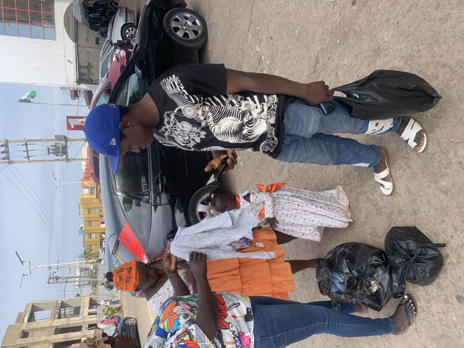 This image depicts an outdoor street scene in Jos, Nigeria, under clear daylight conditions. Four individuals are positioned in the foreground: two adult females, one young female child, and one adult male. The adult female on the far left wears a multicolored patterned top, blue jeans, and a light-colored headwrap, holding a light grey garment. To her right, a second adult female in an orange tiered dress and orange headwrap looks down, seemingly interacting with the same garment. Between these two women stands a young female child, dressed in a white floral-patterned dress accented with orange ribbons on the shoulders and back. Two black plastic bags, containing unspecified items, rest on the paved ground near the feet of the leftmost female. To the right, an adult male wears a blue baseball cap, a black t-shirt with a white graphic design, blue jeans, and white slide sandals. He holds a black smartphone in his left hand and a black plastic bag in his right. In the background, a black hatchback car is parked, with other vehicles and structures visible, including a partially constructed concrete building on the far left and a commercial building on the far right from which a Nigerian flag is flying. Electrical poles and streetlights are also present in the background.