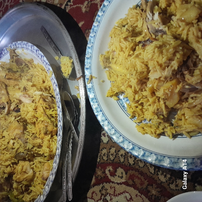 - "Two large plates of yellow rice with chicken pieces, likely Mandi or Kabsa, are presented on a patterned rug in Khan Yunis, Palestinian Territory" by FM-V8KrL2, licensed under CC BY 4.0