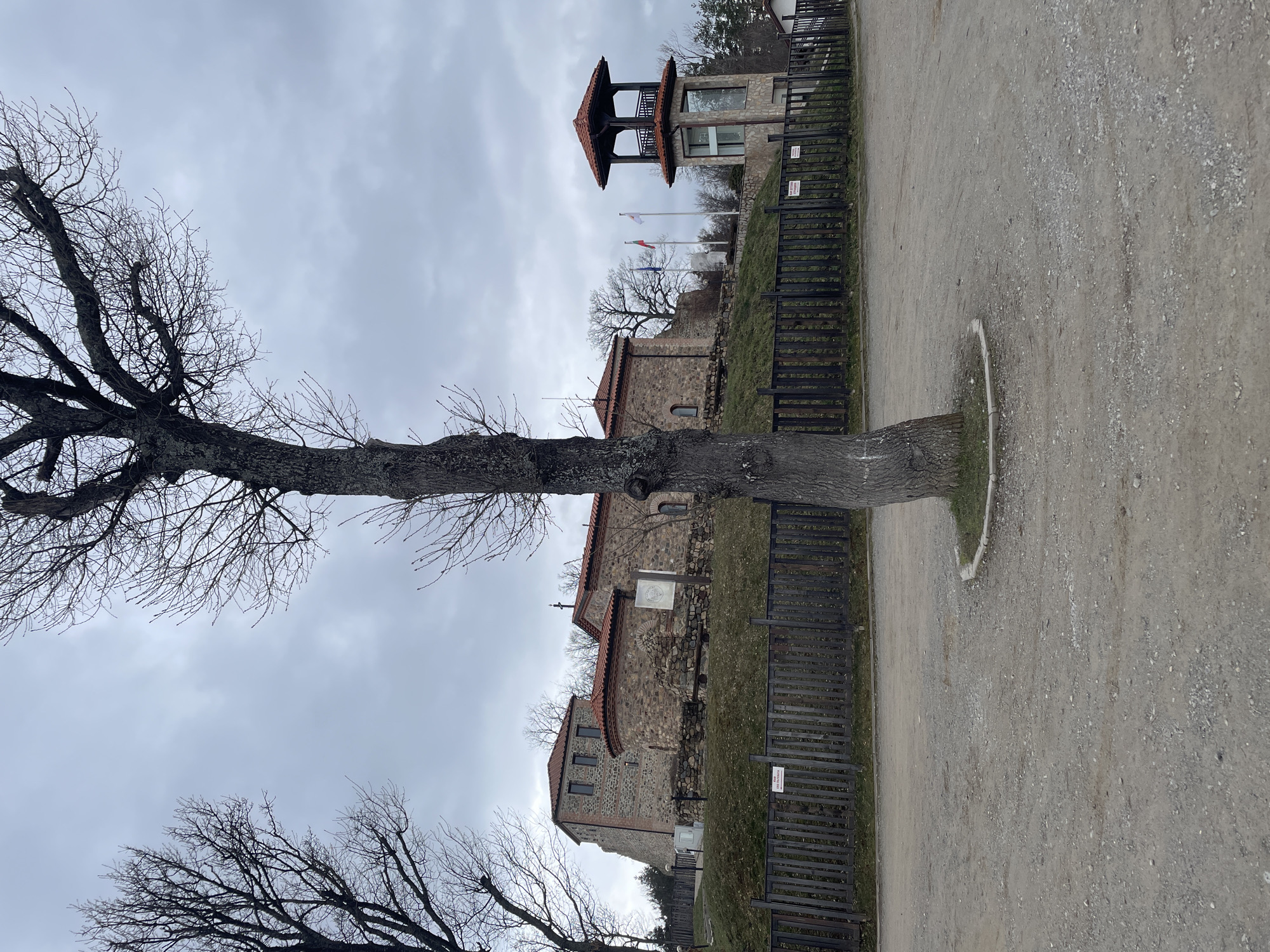 Tsari Mali Grad fortress in Belchin, Bulgaria. The scene depicts a dirt path running alongside a low wooden fence, with a tree standing next to it. Beyond the fence, stone buildings with red-tiled roofs are visible on a slight incline. A tower structure with a red-tiled roof is further up the hill, behind which three flags are flying. The sky is overcast. There are no people present in the image.