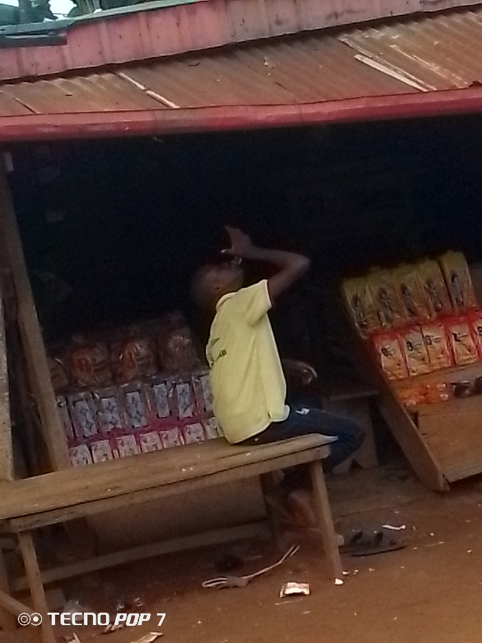 A person in a light yellow shirt sits on a wooden bench, drinking from a bottle. The person leans back and raises the bottle to their mouth. Behind the person is a small store with packaged goods on display. A wooden shelf to the right holds rows of products. The store has a corrugated metal roof, and a pair of flip-flops are on the ground in front of the bench.
