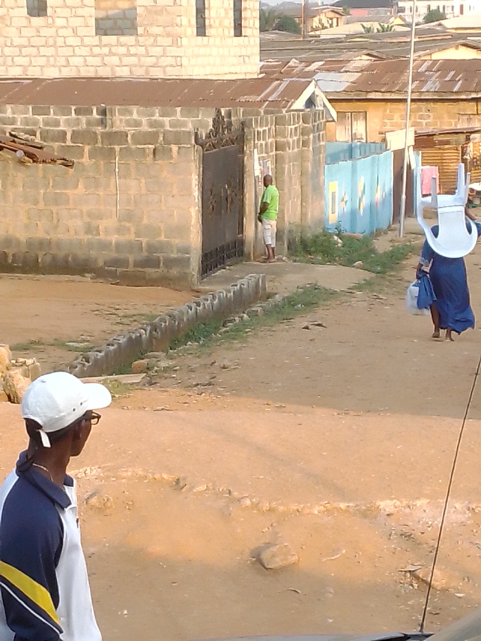 A street scene shows several people and structures. In the foreground, a man with a white cap and eyeglasses, wearing a blue and white shirt, faces away. Behind him, a man in a green shirt and white shorts leans against a metal gate next to a block building. Further down the street, a woman in a blue dress carries a white plastic chair on her head and a bag in her hand. Buildings with metal roofs are visible in the background. The ground appears sandy and uneven.