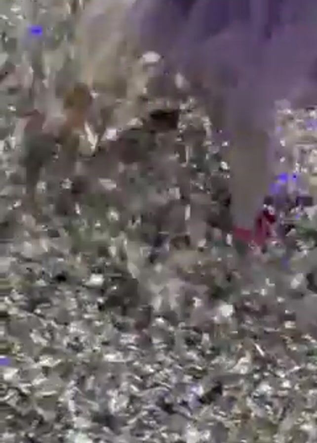 A little girl is having fun in a room covered with silver confetti. At first, the camera focuses on the sea of silver confetti. Then, a girl in a purple shirt dives headfirst into the pile. She lays there for a moment before getting up and starting to play with the confetti, throwing it around and jumping around. There are chairs in the background and some other people are visible.