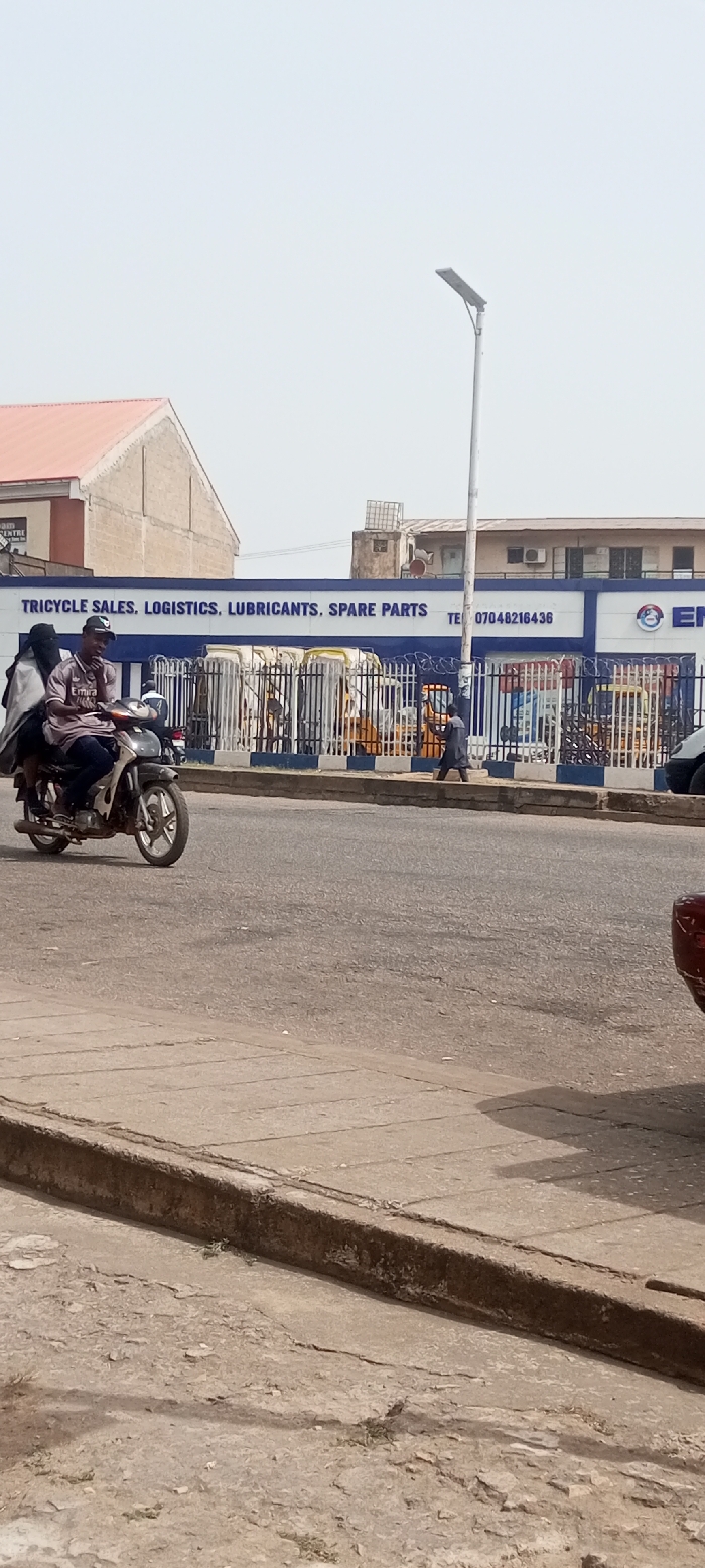 This image captures an urban street scene in Sardauna, Nigeria, during daylight hours under a hazy sky. In the foreground, a concrete sidewalk, exhibiting wear and minor cracks, extends horizontally. It is bordered by an elevated dark concrete curb that separates it from the asphalt road surface, which shows signs of use. In the midground, a black motorcycle, featuring chrome engine components and spokes, travels from right to left. It carries two individuals. The driver, a light-skinned male, wears a grey short-sleeved shirt with a logo on the left chest and dark trousers. He maintains control of the handlebars and appears to be looking towards the camera. The passenger, seated directly behind the driver, is largely enveloped in a dark, full-length garment that obscures most features, including the head. On the far right, a portion of a dark red vehicle's rear is visible. A prominent blue commercial building with white lettering is situated in the background. The text on its facade reads: "TRICYCLE SALES. LOGISTICS. LUBRICANTS. SPARE PARTS" and "TEL: 07048216436". A corporate logo, partially visible as "ENS", is also present. In front of this building, a black metal fence with vertical bars encloses an area containing multiple yellow and white tricycle (keke napep) vehicles. A male pedestrian, dressed in a dark long garment, walks on the sidewalk in front of this fence, moving from right to left. A tall, white pole-mounted streetlight, equipped with a solar panel on top and an LED fixture, stands on the far side of the road. Further in the background, additional structures are visible, including a building with a reddish-brown corrugated roof and a multi-story building featuring air conditioning units.