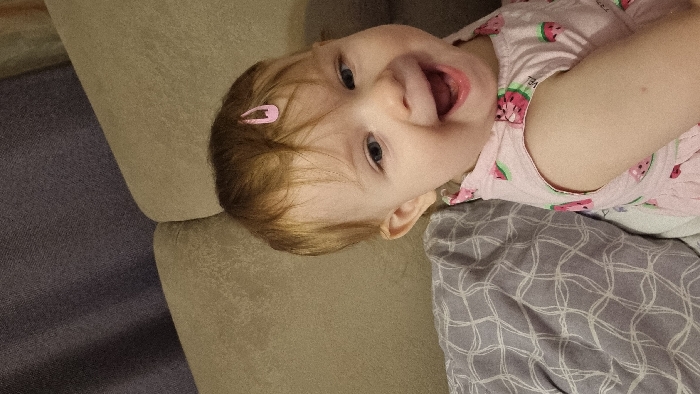 A baby with blue eyes and fair skin is lying on a beige couch with a patterned gray and white blanket. She's wearing a light pink top with a watermelon print. A pink hairpin is visible in her light brown hair. The baby is looking directly at the camera with a wide, open-mouthed smile. Her head is tilted slightly to the side, creating a playful and engaging expression.