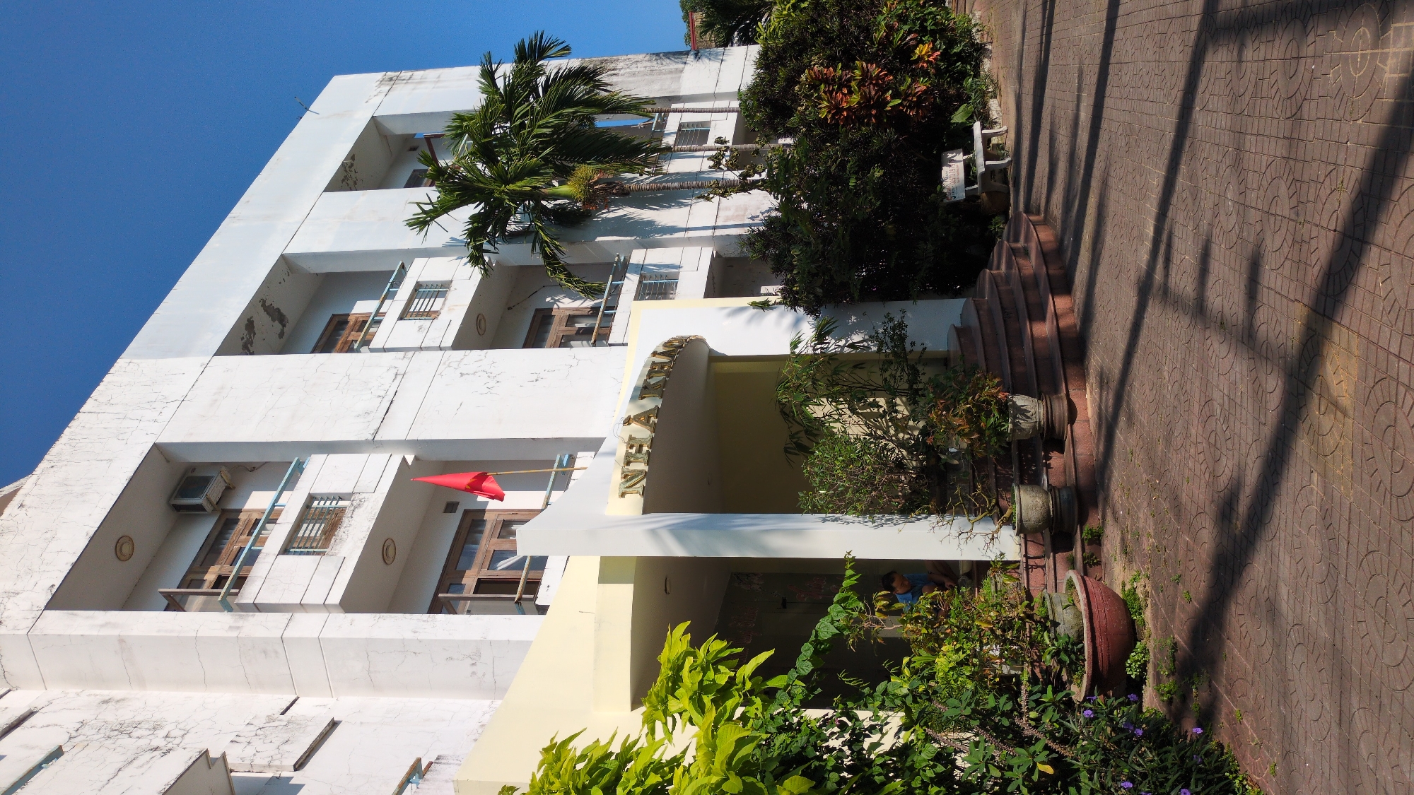 A vertical shot shows a multi-story white building in Tuy Hòa, Vietnam, against a clear blue sky. A tall palm tree and other smaller trees and plants grow near the building, and a red flag is visible on one of the upper levels. The building has a protruding façade with several windows, and the entrance is adorned with gold lettering. A set of stairs leads to the building's entrance, with potted plants on either side. A person is vaguely visible near the entrance among the plants. The foreground shows a patterned brick walkway with shadows.