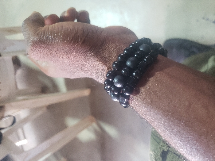 A close-up shows a dark-skinned hand and wrist adorned with three black beaded bracelets