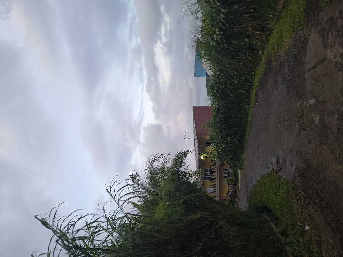 A road curves upward, lined with lush green foliage. Buildings, some with red roofs and yellow walls, peek through the vegetation. The sky is overcast with various shades of gray and white clouds. The landscape evokes a sense of rural scenery on a cloudy day.