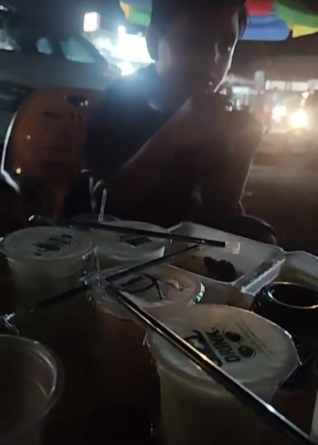 Here's a concise description of the video: The video appears to be shot outdoors at night, likely at a street food vendor. A person is seen sitting behind a table. There are several plastic cups filled with a light-colored drink on the table, labeled with the word "DRINK." Straws are sticking out of the cups. There is also food in plastic containers on the table. The lighting is poor, making it difficult to discern specific details. In the background, there are blurry lights of passing vehicles.