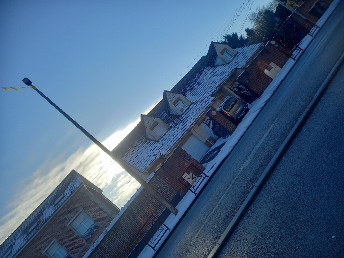 An outdoor scene in Sallaumines, France, depicts a residential street on a sunny winter day, characterized by snow coverage