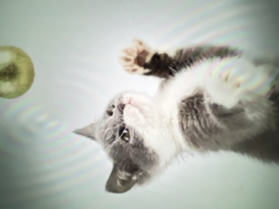 A gray and white kitten lies on its back with its paws in the air, looking up with wide eyes. Its belly is white and the rest of its body is gray. There is a yellow-green orb to the left of the kitten. The background is a solid white color. The image is slightly blurry.