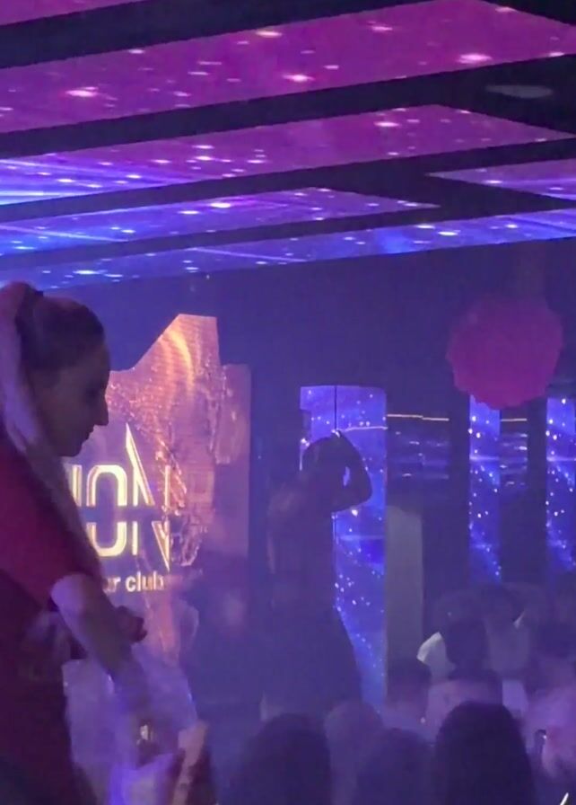 nightclub scene. The lighting is purple and pink, and there are projected images of stars on the ceiling. In the foreground, a woman with long blonde hair is holding a white gift bag and talking to someone off-camera. In the background, a shirtless male dancer in a harness and black pants is dancing on a stage. He also appears to be wearing a neon green hairband. There are other people in the club, some of whom are watching the dancer.