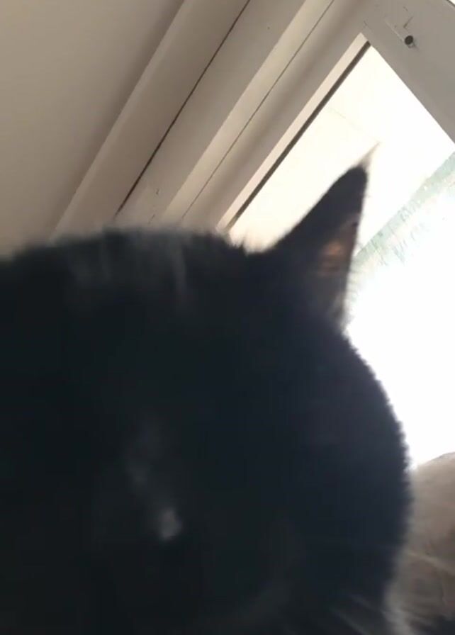 A close-up, low-angle shot focuses on the head of a black cat. The cat's fur is visible, along with the tip of one ear. In the background, a white-framed window lets in bright light. The video appears to be taken indoors.