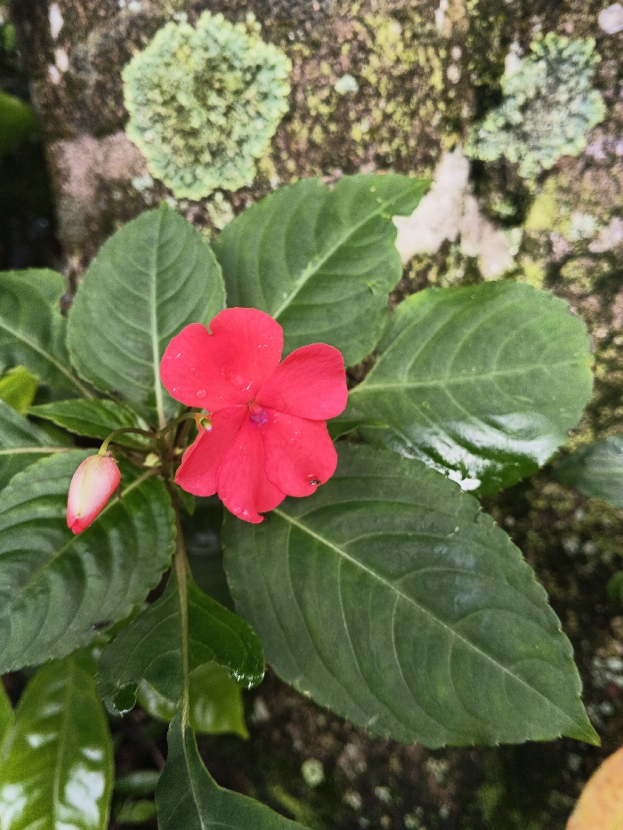 A vibrant red impatiens flower with four petals stands out against a backdrop of glossy, dark green leaves and a budding flower. The leaves display prominent veins and catch the light, reflecting a wet, shiny surface. Behind the plant, a rough, textured wall with patches of light green lichen adds a contrasting element to the image.