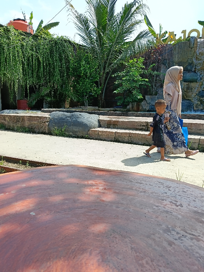 A woman in a hijab and a young child walk along a concrete path next to greenery and a stone waterfall feature. The woman wears a long dress and sandals, carrying a blue bag. The child wears dark clothing and sandals. The path is lined with stone steps and a large, dark rock. The foreground is dominated by a large, rusty object obscuring the view. Trees and foliage are abundant in the background.