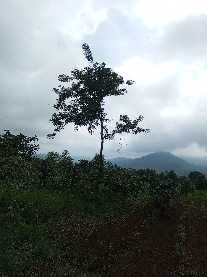 The image depicts a rural, agricultural landscape in Kondha, India, under an overcast sky filled with dense, light gray clouds. A prominent, tall deciduous tree stands centrally in the mid-ground, characterized by a slender, vertical shoot extending above its main canopy of dark green foliage. The mid-ground is densely covered with numerous smaller, dark green trees or shrubs, suggesting a cultivated area or orchard. The foreground features sloping terrain with tilled, dark brown soil arranged in discernible rows on the right, contrasting with patches of green grass and low vegetation on the left. In the background, undulating hills and mountains are visible, partially obscured by atmospheric haze or mist. A slender, vertical structure, possibly a communication tower, is faintly discernible on a distant mountain peak. No individuals, animals, or active human interactions are present in the scene.