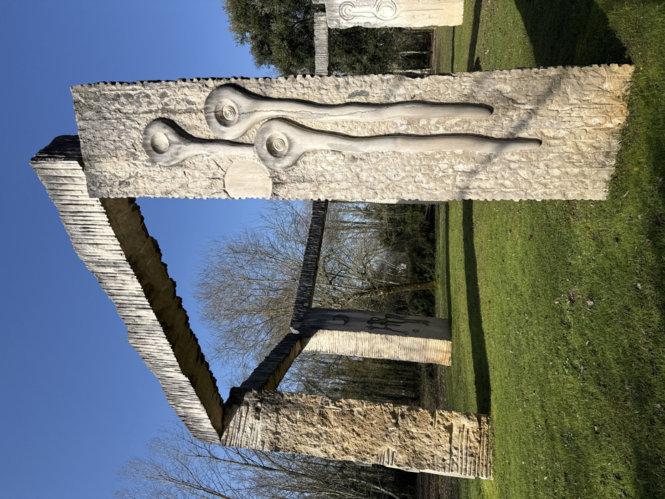 The image displays an outdoor sculptural park located in the city of Mealhada, Portugal, under a clear blue sky. In the foreground, a prominent light-colored stone pillar stands vertically on the right. Its surface is textured, and it features three elongated, spoon-shaped depressions carved into its face, each containing a concentric spiral design at its wider, rounded end. A partial circular relief is visible adjacent to the upper two shapes. This pillar is structurally connected overhead by a thick, horizontal stone beam with a distinctive ridged underside. To the left, a robust yellowish-brown stone pillar, also with a rough-hewn surface, forms another part of the overarching stone structure. Additional stone pillars, varying in height and design, are dispersed across a vibrant green grassy field in the midground and background. One midground pillar on the left displays dark, abstract stick-figure-like carvings. Long shadows are cast across the grass from the structures, indicating a strong light source. The background is dominated by a dense line of trees, mostly deciduous with bare branches, suggesting a wooded area, with some evergreen trees visible on the far right. No individuals or animals are present in the scene.