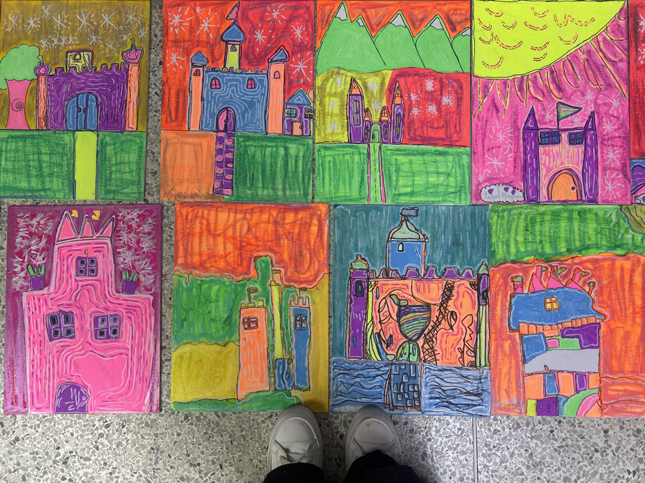 The image displays 16 vibrantly colored, rectangular artworks arranged in a 4x4 grid on a light grey-speckled tiled floor. Each artwork depicts simplified, stylized buildings, houses, and castles, often incorporating landscape elements such as trees, mountains, water, and abstract patterns. The pieces are characterized by thick black outlines and a palette of saturated, neon-like colors including pink, green, orange, blue, purple, and yellow. On the left side of the frame, the lower legs and feet of an individual are visible, wearing dark trousers and white lace-up sneakers, positioned over the tiled floor and adjacent to the displayed artworks. The specific location in Valencia, Venezuela, is not discernible from the visual evidence provided.