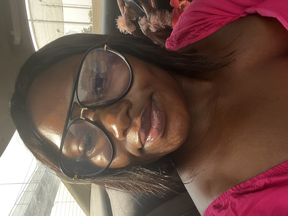 An adult female is depicted in a close-up, head-and-shoulders portrait, taken inside a vehicle in Kuchingoro, Nigeria. She has dark skin, dark, straight hair, and is wearing large, black-framed aviator-style sunglasses with gold accents. Her lips are glossy and have a reddish-pink hue, and she exhibits a slight smile. She is dressed in a bright pink top that exposes her shoulders. The dark interior of the vehicle, including a seat back and roof lining, is visible behind her. Through the vehicle's windows, a bright, sunlit outdoor environment is discernible. To the upper left, a large, light-colored overhead structure, potentially a pedestrian bridge or overpass, is visible. To the upper right, a large white structure and utility lines are present against a hazy sky. Reflections of the outdoor scene are visible in the lenses of her sunglasses. A blurred object with light brown, fluffy material is partially visible to the right of her shoulder.