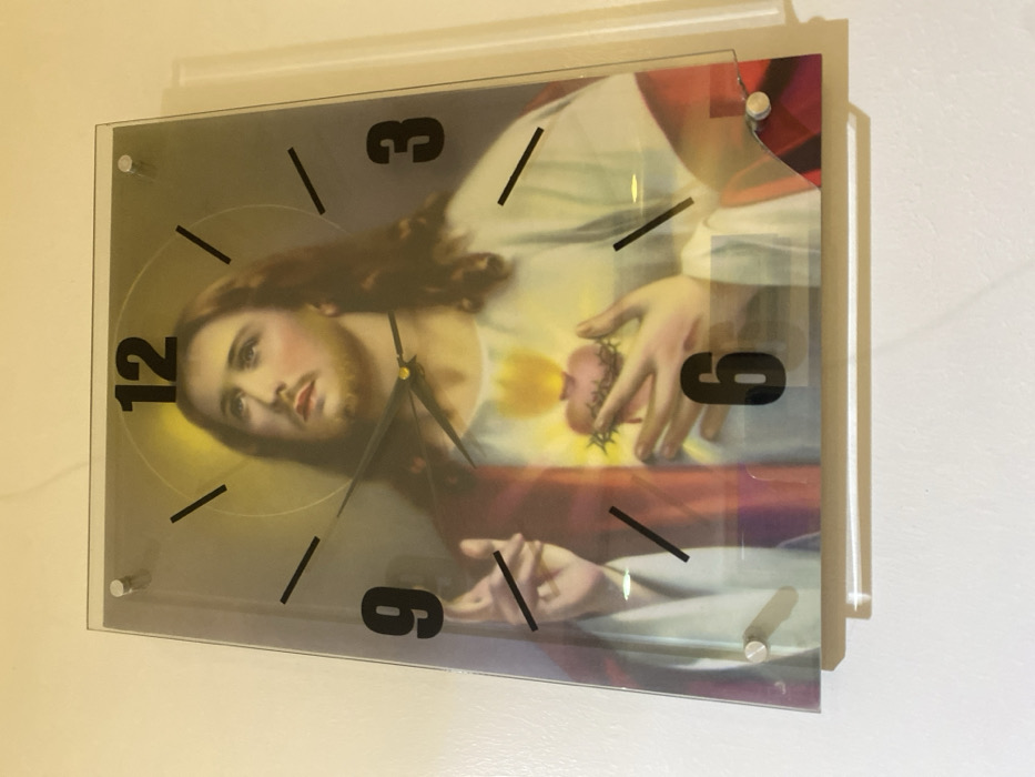A square clock features a religious image. Jesus Christ is depicted with long brown hair and a beard. His hands are visible, one holding a heart with thorns. Numerals representing the hours are placed around the image. The clock hands indicate approximately 10:20. The clock is mounted on a wall, and its layers and fixings are visible.