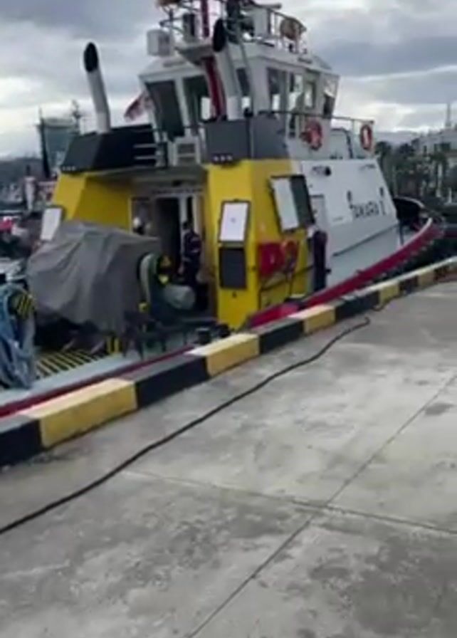 pier, a tugboat, and a lot of go-karts. The tugboat is docked at the pier. It is painted yellow, white, black, and red. "TAMAR" is written on the side of the boat in red letters. The pier is made of concrete and has a yellow and black painted edge. Across the pier, there are a row of buildings, and in the background, there are mountains. The sky is overcast. The camera pans to show a large concrete area where many go-karts are parked. There are go-karts of various colors and sizes. Some people are walking around in the background. There are trees in the area.