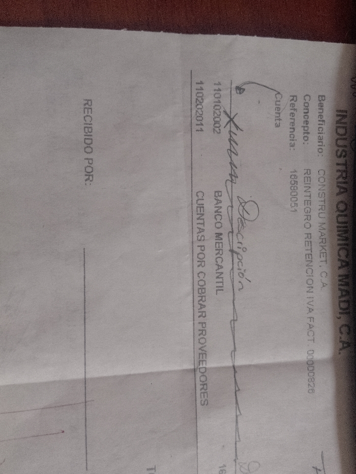 The document is a receipt from Industria Quimica MADI, C.A., indicating a payment to Constru Market, C.A. The payment is described as a "Reintegro Retencion IVA Fact." referencing number 00000826 and has a reference number of 16580051. It mentions two bank accounts: 110102002 at Banco Mercantil and 110202011 categorized as "Cuentas Por Cobrar Proveedores". The document is signed, marked as "Recibido Por" and includes an area for the description.