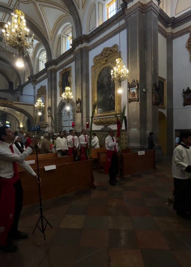 procession inside a grand church. The church features high vaulted ceilings adorned with ornate chandeliers. The walls are lined with large, framed paintings and detailed architectural elements. Several people wearing white shirts and red sashes stand along the sides, holding palm fronds. They appear to be part of a religious ceremony or celebration. A person at the left is holding a microphone attached to a tripod. Other people in black robes are walking down the aisle. The floor is covered with a tiled pattern.