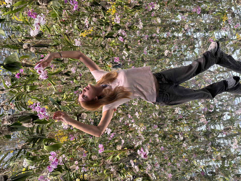 A young adult female stands centrally within the "Floating Flower Garden" exhibit at teamLab Planets TOKYO in Toyosu, Koto, Japan. She has light brown hair and wears a light pink polo shirt, dark gray jeans, and white and black sneakers. A silver-colored bracelet is visible on her left wrist. She is looking upwards and slightly to her left, with both arms raised above her head and hands open, reaching towards the dense array of orchids. The environment is an indoor botanical installation featuring numerous suspended orchids and other epiphytic plants, predominantly in shades of pink, white, yellow, and purple, interspersed with green foliage and moss. The floor is highly reflective, mirroring the entire floral display and the lower half of the woman's body, creating an immersive, infinite floral illusion. The scene is brightly illuminated.