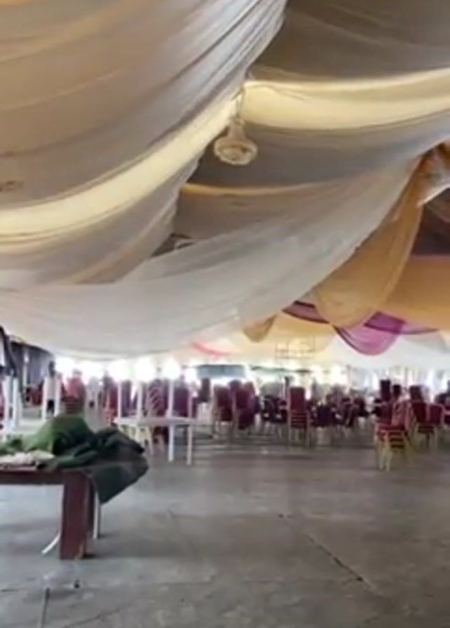 interior of a large event space, likely a banquet hall, that is set up for an event. The room is decorated with draped fabric in white, gold, and purple colors hanging from the ceiling. Chandeliers are visible amidst the fabric. There are many tables and burgundy-colored chairs arranged throughout the hall. The floor appears to be concrete. The space is mostly empty. Some objects covered in a green cloth are in the foreground on a table.